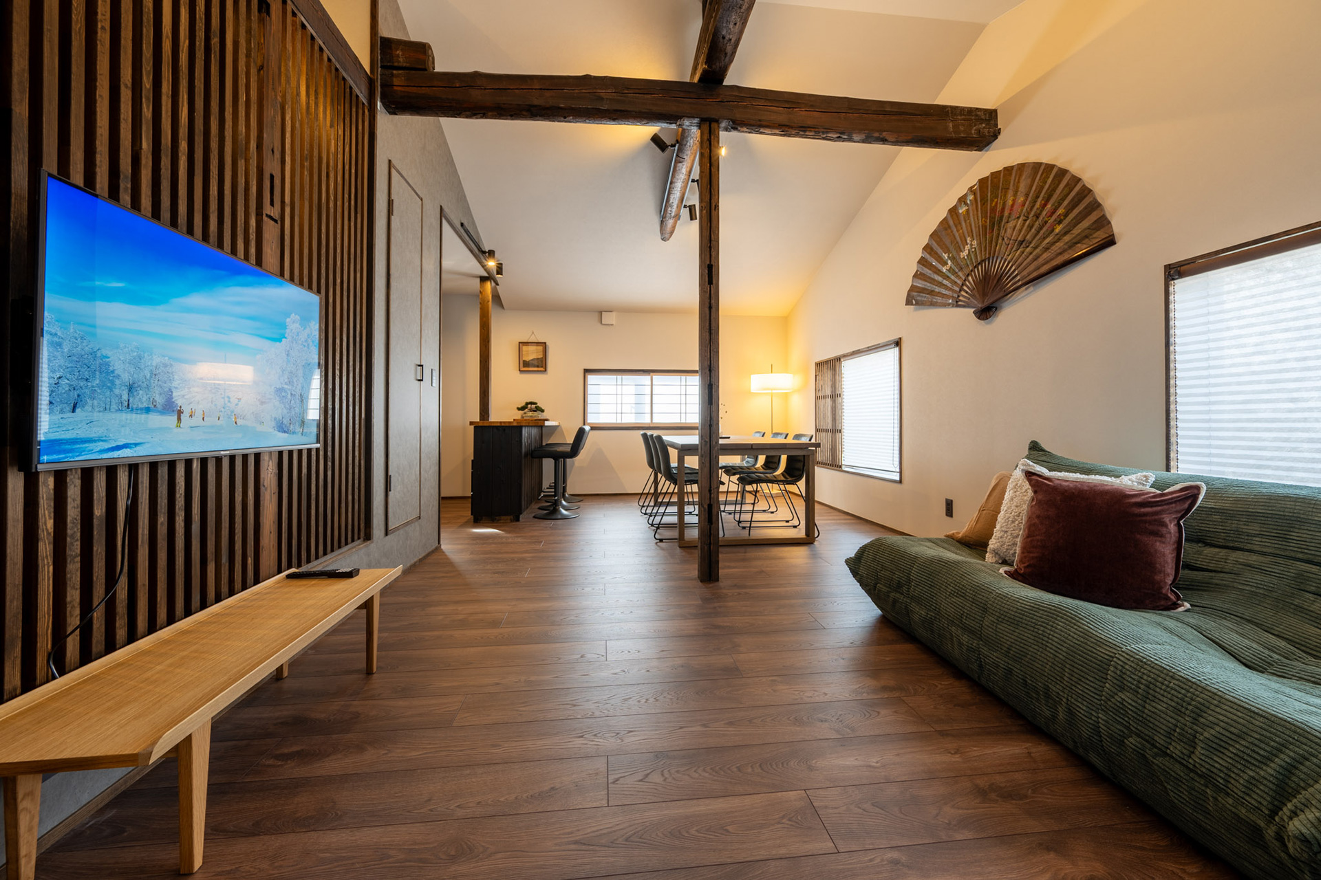 - 広々としたリビング・ダイニング: グループでの夕食や、スキー後の団らんにも十分なスペースを確保。