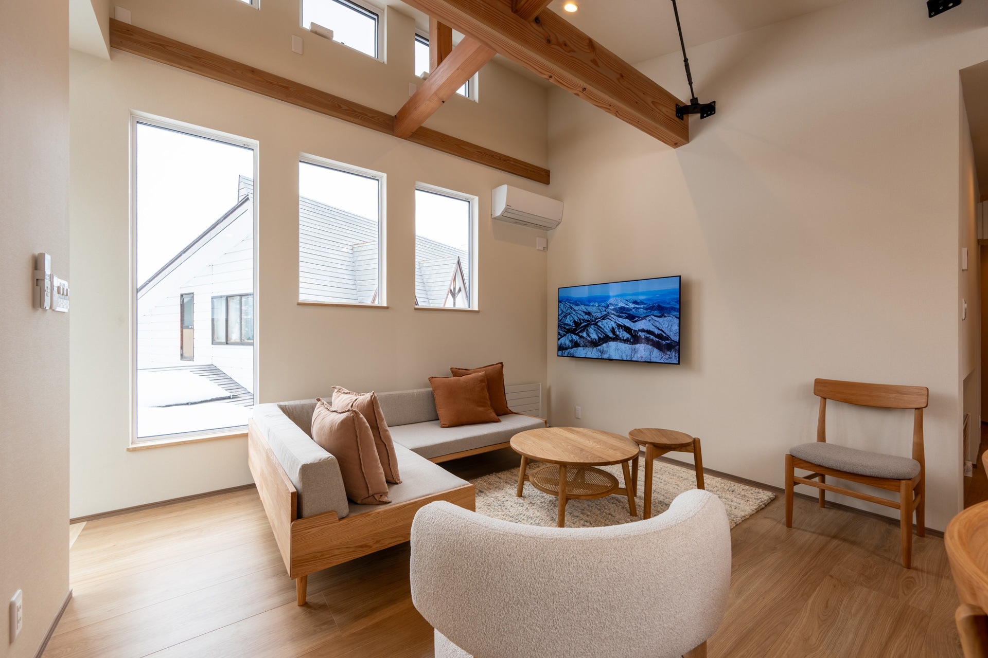 Set across two levels, Bonbori Ni sleeps up to 8 and offers a peaceful alpine retreat with a touch of luxury. There’s one bedroom downstairs and two upstairs, all with ensuite bathrooms—ideal for groups who appreciate a little more privacy. The top-floor master features a lofted ceiling and a cozy retreat feel, while the open-plan kitchen and lounge area is perfect for slow mornings and snowy nights in.